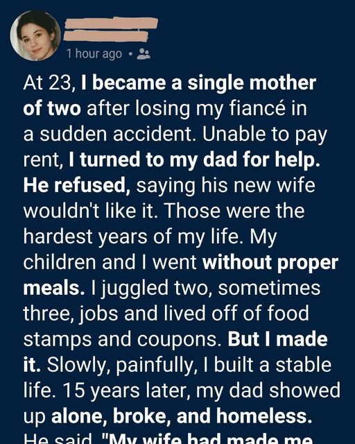 Fifteen years later, there was a knock at my door. When I opened it, I barely recognized him. My father looked smaller. Older. Defeated. His wife had left him. He’d lost everything. He asked if he could come in—“just for a week,” he said. And suddenly, I was twenty-three again, standing in front of someone who once chose not to help.