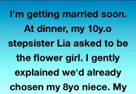 At dinner, my ten-year-old stepsister Lia looked up from her mashed potatoes, her eyes wide and hopeful. She asked if she could be the flower girl. It was one of those moments where the air seems to leave the room because I knew the answer was going to hurt her. I love Lia in my own way, but she’s always felt like a symbol of how quickly my father moved on from my mother’s memory. I gently explained that we’d already chosen my eight-year-old niece, Sarah, who is my brother’s only daughter. I told her that the roles were already set and the dresses had been ordered months ago.
