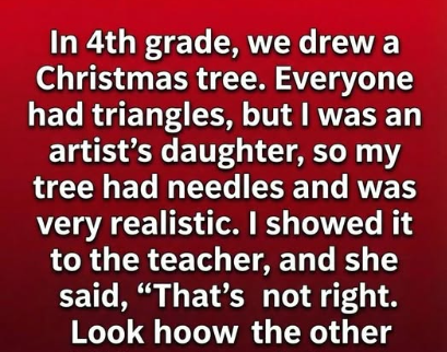 Growing up in a home where art supplies were as common as kitchen utensils, I had learned to observe details. I drew a tree filled with fine lines for needles, uneven branches, and a shape that leaned slightly, like real trees often do. I was proud of it. When I handed my paper to the teacher, I expected curiosity or maybe a question. Instead, she frowned, held it next to another child’s drawing, and told me it was “wrong.”