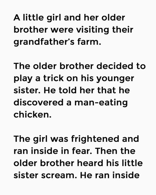 He told her that he discovered a man-eating chicken. The girl was frightened and ran inside in fear. Then the older brother heard his little sister scream.