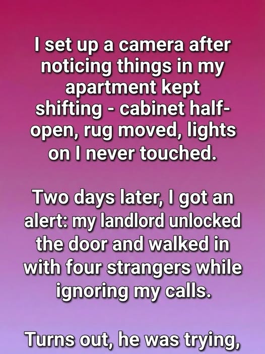 For two full days, nothing happened. The apartment remained still, unchanged, and I felt almost foolish for doubting myself. Then, in the middle of an ordinary work meeting, my phone buzzed with a motion alert. When I opened the feed, my breath caught. The front door opened, and my landlord stepped inside, followed by several strangers. There was no rush, no hesitation. They moved through my home casually, pointing at walls, opening cabinets, stepping around furniture as if the space belonged to no one at all. I called immediately, once, twice, again and again, but no one answered. Watching it happen from a distance made it feel surreal, like observing someone else’s life instead of your own, yet the violation was unmistakable.