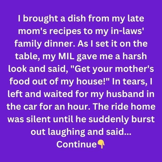 I’m 25 and newly married to my loving husband, 28. Last weekend, I brought a dish from my late mom’s recipes to my in-laws’ dinner. My MIL glared at me and said, “Get your mother’s food out of my house!” Devastated, I left and waited in the car.