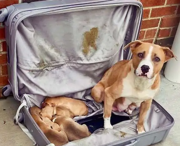 Curious and concerned, they cautiously unzipped the suitcase, and what they found inside left them speechless. A terrified mother dog, her body trembling with fear, lay curled protectively around her five newborn puppies.