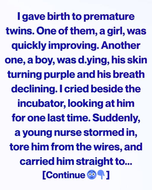 Suddenly, the heavy doors swung open. A young nurse, driven by an instinct that defied every hospital protocol, stormed into the room. She didn’t stop to check the charts or wait for a doctor’s permission. With a sense of urgency that startled the grieving mother, she reached into the incubator and “tore him from the wires” that were failing to keep him stable.