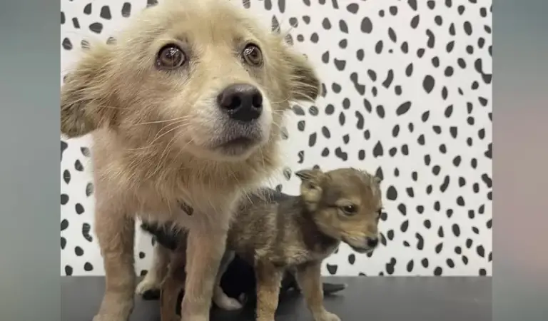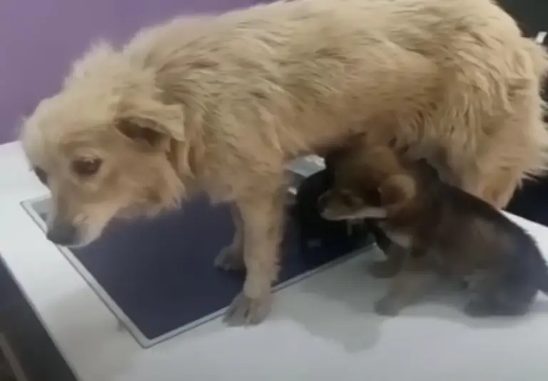 It was clear she had reached her limit. Still, her trembling body pressed close to her puppies, proving that a mother’s instinct is stronger than pain.