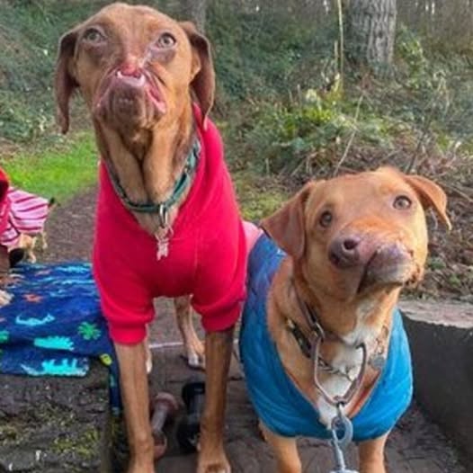 At the edge of a quiet forest, there was a small path where two very special dogs lived. They were brothers – one wore a red sweater, and the other wore a blue one. Their faces looked different from most dogs, but their hearts were full of love.