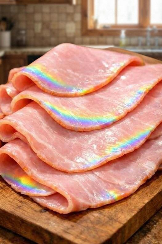 Many people notice something unusual when opening a package of deli ham for the first time: a shiny, rainbow-like shimmer across the slices. The colors shift between greens, purples, and blues, sometimes giving the meat a metallic appearance that can feel unsettling.